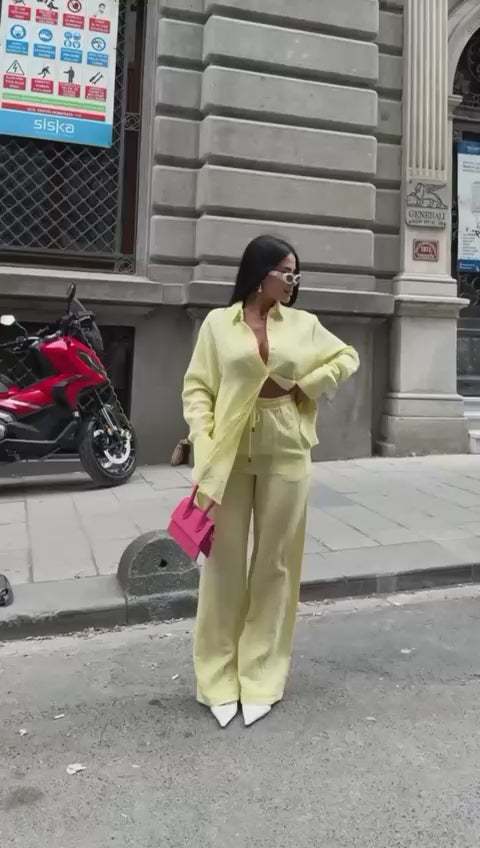 Compleul format din pantaloni lungi și cămașă din mosalină este elegant și rafinat, cu un material fluid care cade perfect pe corp. Este ideal pentru o ținută chic, oferind confort și un aer sofisticat, potrivit pentru evenimente sau zilele de birou.