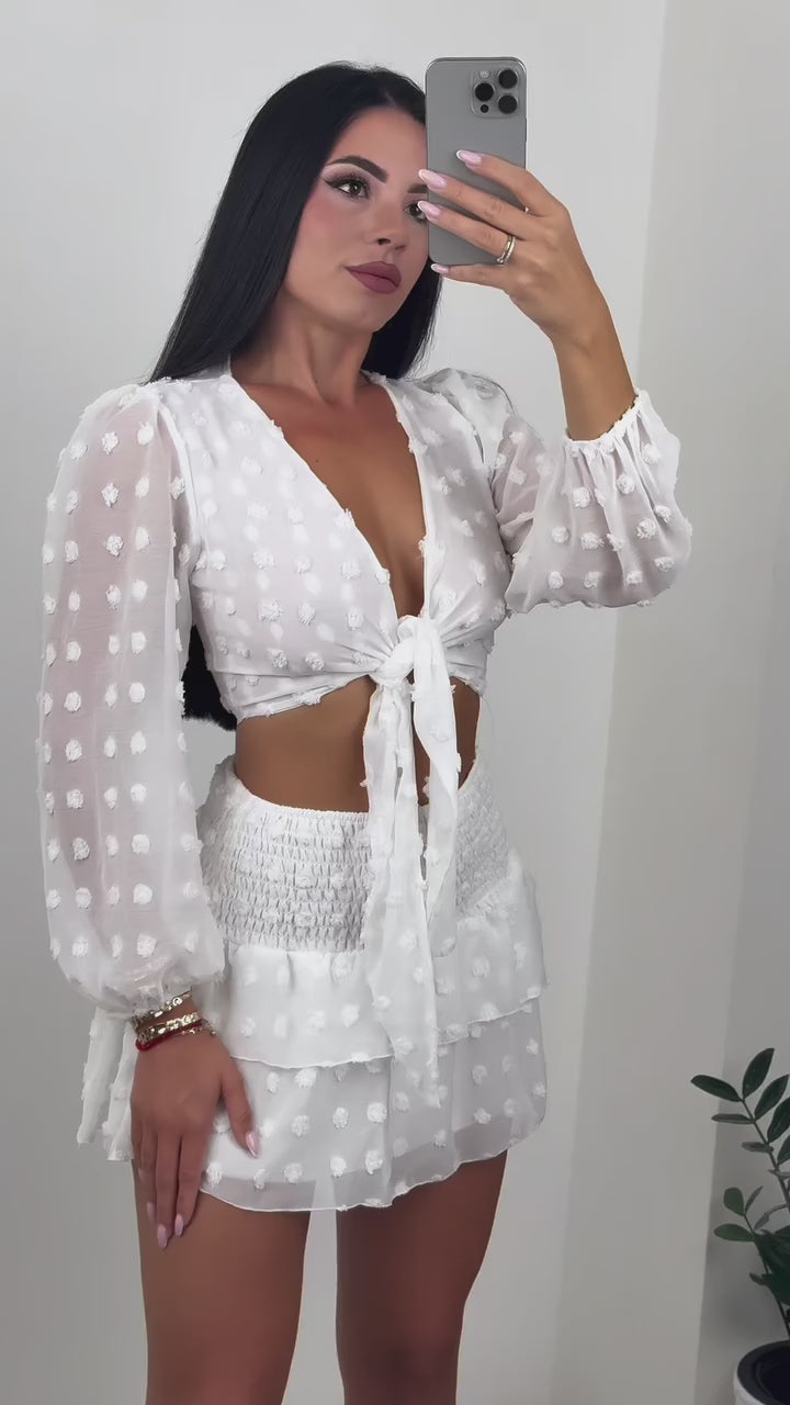 Un set minunat din doua piese din voal cu broderie 3D. In video gasiti o sugestie de prezentare, dar il puteti accesoriza dupa preferinte.